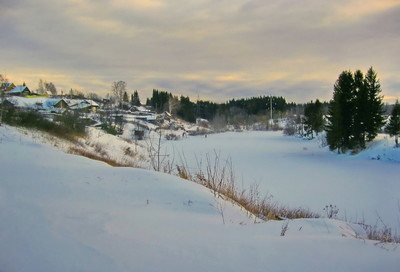 Деревенька и пруд зимой..