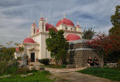 Церковь 12 Апостолов.Капернаум Церковь находится на берегу о.Кинерет.По преданию,здесь Иисус Христос ходил по воде. В Капернауме, согласно Евангелиям, проходила основная проповедническая деятельность Иисуса Христа. Тогда город представлял собой рыбачий поселок и таможню на пути из Кесарии в Дамаск[1]. В Капернауме Иисус обрёл своих апостолов — Петра, Андрея, братьев Зеведеевых Иоанна Богослова и Иакова и Левия Матфея. Во II веке в Капернауме образовалась община евреев, перешедших в христианство. В следующем столетии в городе была построена церковь, и он стал оплотом христианства в районе.Греческая церковь Собора Двенадцати Апостолов. Построена в 1930-х годах на части территории евангельского Капернаума. Выполнена в традиции церквей островной Греции, состоящий из кубов и куполов в виде полусфер. Однако, в отличие от собственно Греции, где купола обычно красят в синий цвет, здесь они оказались красными. Это превратило небольшую церковь в яркую цветовую доминанту панорамы. Территория монастыря интересна не археологическими раскопками, а царящей здесь атмосферой патриархального поместья с полузапущенным, но по-южному богатым садом с павлинами. Убранство церкви непривычно яркое и радостное. |
