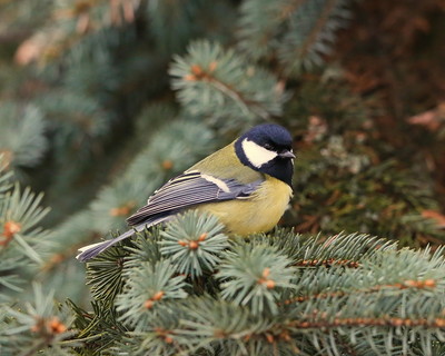 Большая синица Хорошо известная птица размером с воробья. Голова и горло черные, верх головы у взрослых птиц с металлическим отливом. По бокам головы ниже глаз - белые пятна («щеки»). Спина серо-зеленая, маховые и рулевые перья серые. Грудь и брюхо желтые, посреди груди проходит черная полоса, которая у самцов в нижней части расширяется и достигает подхвостья, у самок и молодых птиц постепенно затухает на брюхе. Клюв черный, ноги синевато-серые. Вес самца 14-23 г, самки 15-24 г. Длина тела (оба пола) 13-15 см, размах крыльев 22-25 см. Длина крыла самцов 6,5-8 см, хвоста 5-7 см, цевки 2-3 см, клюва 1 см. Длина крыла самок 7-7,5 см, хвоста 5,5-7 см, цевки 2 см, клюва 1 см. |