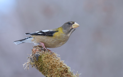 Evening grosbeak (female) Зачастую у птиц цвет оперения у самок намного скромнее, чем у самцов . В течение сезона гнездования они формируют моногамные пары, ухаживая спокойно без какой-либо сложной песни или показа. Самка строит большую часть гнезда, собирая материалы с земли и срывая ветки с деревьев. Она строит хрупкое, блюдцеобразное гнездо из маленьких веточек и корней, выстланных травами, тонкими корнями, лишайниками или хвоей. Самец может кормить самку во время инкубации и оба родителя кормят птенцов. |