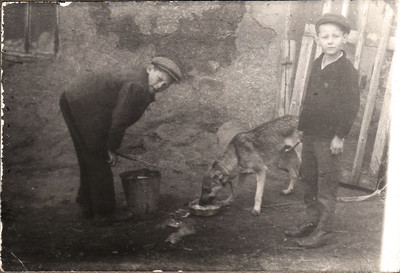 Два брата и собака Кормление собаки примерно в 1966 году обратом принесенным с колхозной фермы для теленка. |