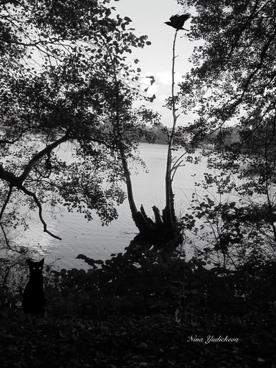 Черный кот и птица украсили снимок ... замечательно!