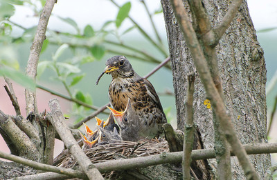 Дрозд рябинник кормит птенцов. Россия. Тульская область. Ленинский район. Архангельское.