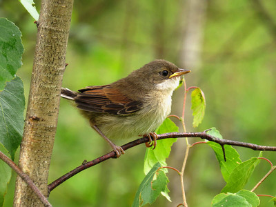 Слеток серой славки Славка серая нередко селится по соседству с камышевкой болотной. Для гнезда выбирает молодое деревце или куст: дуб, березу, терн, шиповник, смородину. Высота от земли до гнезда редко бывает выше полуметра. Нередко славки серые вьют гнезда и почти на земле — в поросли пижмы, таволги, крапивы. Заметить такие гнезда сложнее. Подобно другим славкам, самец, дожидаясь прилета супруги, начинает строительство сразу нескольких гнезд, одно из которых потом доделывает самка. Гнезда соседних пар могут быть удалены друг от друга всего на 20–30 м. Характерная особенность гнезд — наличие в верхней части бортиков светлых комочков растительного пуха (тополиного, ивового и др.) или пучков паутины. В первой половине июня можно найти уже полные кладки, состоящие из четырех-шести яиц желтоватого цвета с серыми пятнышками. Инкубация продолжается 10–13 суток. Птенцы покидают гнездо уже на 10–11-е сутки, но научатся летать они лишь спустя неделю. Во время выкармливания потомства обнаружить его местонахождение можно по летающим с кормом родителям. |