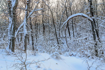 Утром в заснеженном лесу. Снег в лесу. Много снега.. Снег на ветвях деревьев. После снегопада. При утреннем зареве зари.. Утром на рассвете.. Занесенный снегом лес ранним утром.