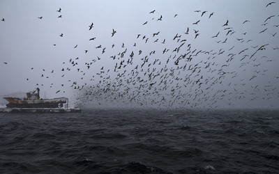 Огромные скопища летающих чаек. Штормовой ветер. Заряды снега. Пирс в Южно-Курильске. Остров Кунашир.
