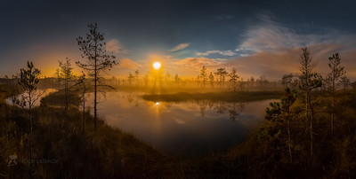 Сказка только начинается Летнее полнолунье на болотно-озёрном комплексе. Луна только поднимается, поэтому, плюс ещё сквозь туман, свет её оранжево-золотой. Буквально через 15-20 минут, когда луна поднимется выше над атмосферной дымкой, оттенок света станет холодно-белым. Всегда, если есть прогноз на туманную ночь, я стараюсь фотографировать ночные пейзажи до того как луна поднимется высоко, чтобы поймать очень редкий момент – золотой лунный свет, такой оттенок бывает, только если густой туман уже стелется по земле. Из фотопроекта «Магия Ленинградской области». Август, 2018 года. |