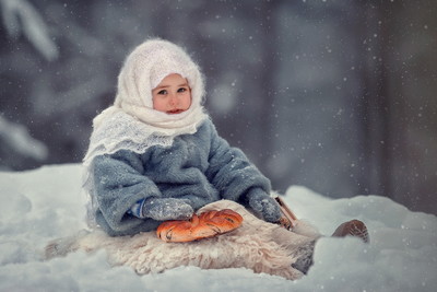 чудо как хорошо. и платок правильно повязали и на меха посадили, и шубка классная и валеночки к месту. цветовая гамма замечательная. а вот про магазинную булку не поняла. нмв, чужая она тут - холодная и мокрая от снега...