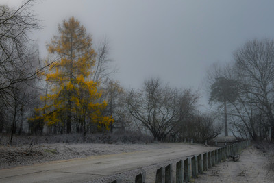 Лиственница на набережной Волги. Туман.