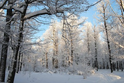 По заснеженной тропинке.