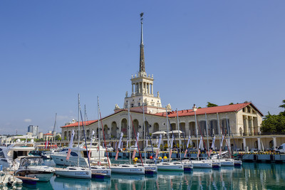 Россия, Краснодарский край, Сочи, Черное море, здание морского вокзала, причал, парусники, яхты, весна, день