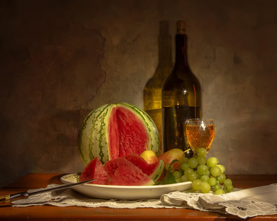 Позволю себе немного...качество работы замечательное, сам главный персонаж великолепен...сахарен и фактурен... В работе есть три момента, которые мне бросились в глаза...блики от освещения на стекле.... обрезаная ручка ножа....и закрытые груши...понимаю, что в натюрморте по-любому что-то да будет закрыто....извините, это я просто груши люблю...)))))