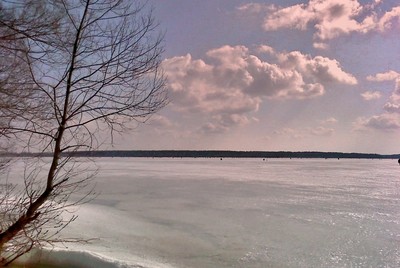 Много рыбаков собралось на льду большого озера на подледный весенний лов рыбы