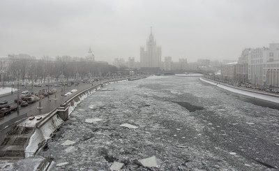 Весна, по реке прошел ледокол и разрушил ледяное поле на реке. В тумане скрывается высотное здание на Котельнической набережной