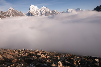 Видимо - не видимо С горизонтом все в порядке, облака справа переползают через отроги гор. Склон Гокио-ри. Через минуту я войду в это облако. Мне предстоит спуститься к приюту на 300-400 метров по вертикали, пережидать нет смысла, потому как облачность все больше и больше накатывает, к тому же скоро стемнеет. В тумане встретил стайку гималайских полосатых куропаток. Обычно пугливые, они остервенело разрывали клювами почву в поисках червяков, подпустив меня на 3 - 4 метра. |