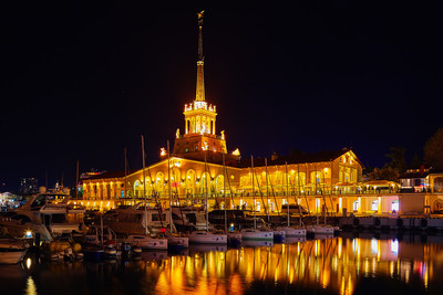 Россия, Краснодарский край, Сочи, Черное море, здание морвокзала, причал, лодки, яхты, весна, ночь