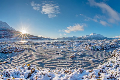 Восход солнца на отливе во фьорде. Район Тромсе Северная Норвегия. Февраль 2019