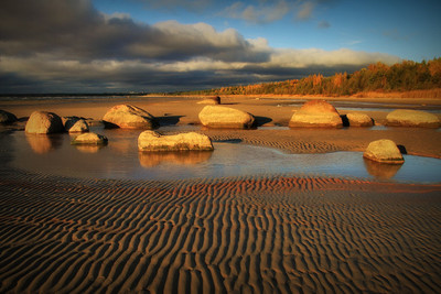 А я бы оставил только передний план и камни... /но-моему и берег, и небо только "разжижают" визуальный акцент... Нравится.