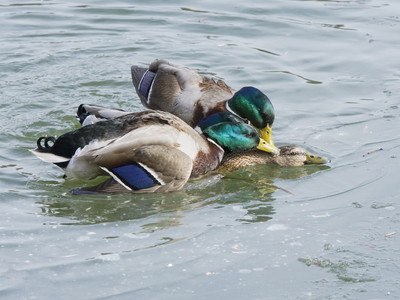 Призраки весны Вначале я пожалел эту уточку, посчитав, что творится насилие. Думал, что когда вырвется - сразу улетит. Но нет: когда всё закончилось, т.е. все закончили, она вылезла на лёд, отряхнулась, оправила пёрышки и села отдыхать с этими селезнями... |