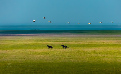 Наперегонки Лошади бегут наперегонки со стаей кудрявых пеликанов, в степи на берегу озера Маныч-Гудило. Государственный природный заказник краевого значения «Маныч-Гудило». Фотопроект «Открывая Ставрополье». 4 апреля, 2019 год. |