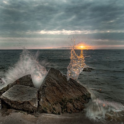 . Вода подсвеченная солнцем, разбиваясь о скалы