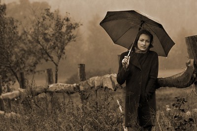 Боже!... Как же замучали меня эти трое с фотиками... Сколько можно надо мною издеваться? Мало того что заставили в платьице на ветру, на какой-то горке позировать, гоняли по заброшенному коровнику, так ещё и под дождём им тут позируй.. Спасибо хоть зонт дали, изверги