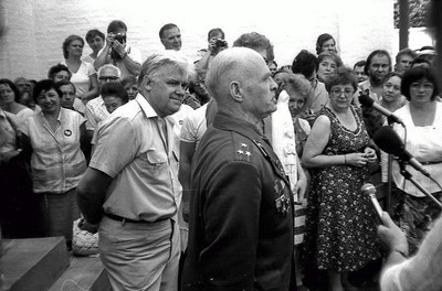 Ерофей Михайлович Левшов, гвардии полковник участник штурма Рейхстага и ареста Берии, убитый выстрелом в затылок неизвестным 7 января 1992 года, на митинге общества "Память" на заводе "Динамо" у Храма Рождества Пресвятой Богородицы в Старом Симонове, Москва 1988 год. |