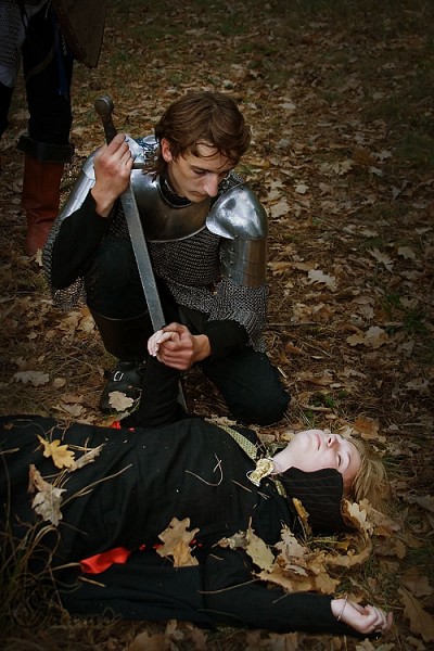 сначала подумалось, что рыцарь добивает девушку ударом холодного оружия в руку