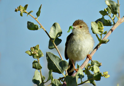 Приния изящная с уловом Приния изящная (Prinia gracilis), Семейство: Цистиколовые. Одна из самых маленьких птичек в Израиле. Длина тела 13см, вес ок. 7гр. Гнездо располагает в кустарнике или куртине травы на высоте до 1 м над землей. |