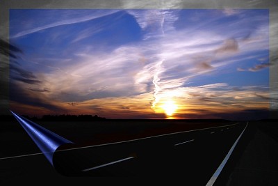 Эффектное небо- простая, но лаконичная композиция- офомление немного кичевое, но и нескучное- добавляет работе... Мне кажется- под отвернутым уголком и на его обороте стоит протереть ластиком полосу разметки дороги...