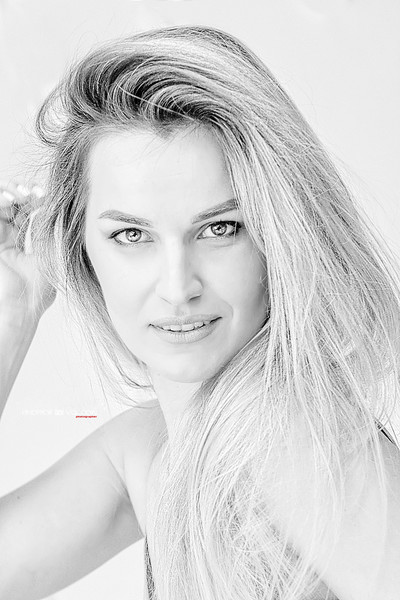 хороший портрет highkey, за исключением красной подписи по центру чб кадра