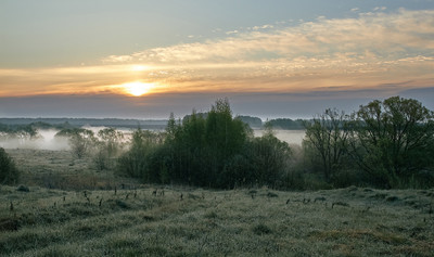 рассвет,туман,деревья