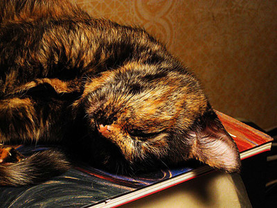 Кошка спит на альбоме