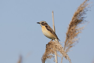 Луговой чекан сидя на верхушке тростника-охраняет свою территорию