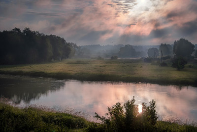 Река Москва под Можайском. Клубы густого утреннего тумана пролетая над землей, тают под первыми лучами утреннего солнца.