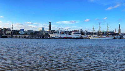 Набережная Эльбы. Гамбург один из крупнейших портовых городов в Европе, расположен у места впадения реки Эльбы в Северное море.