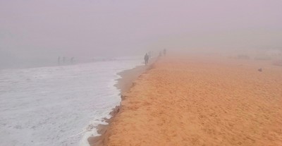 Сложилась драматическая ситуация, купающемуся в тумане и при морских волнах, человеку стало плохо и его вытаскивают на берег.
