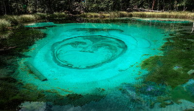 Горный Алтай. Чуйский тракт недалеко от села Акташ. Небольшое термальное озеро с голубой глиной. Гейзер просыпается время от времени и рисует на дне озера причудливые рисунки