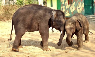 В борьбе двух слонят явно проявляется неравенство сторон, хотя малыш вовсю старается!