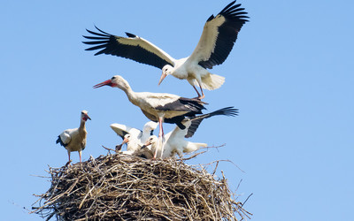 Семья аистов прилетела на отдых в родное гнездо. Аистята уже прекрасно летают. Им скоро надо будет отправляться в дальний путь, причем без родителей.