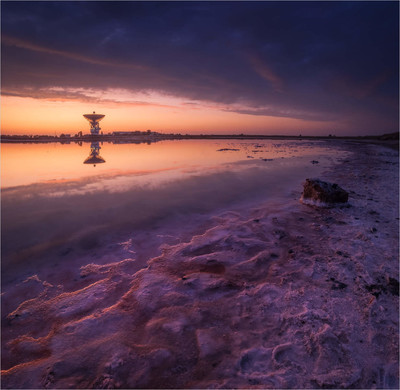 Радиотелескоп РТ-70 и соленое озеро на закате.