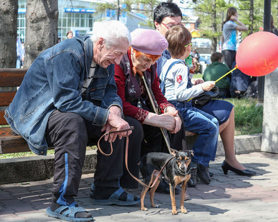 Пара пожилых людей присели на лавочку и с умилением смотрят на свою собачку и разговаривают.