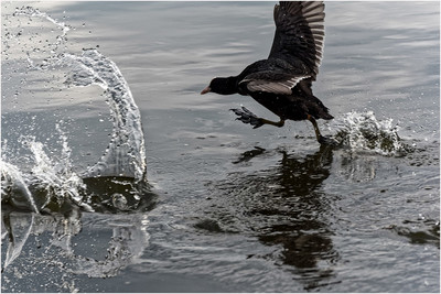- Ну, селезень, держись! Пальцы у лысухи, в отличие от других водоплавающих птиц, не связаны перепонками, а лишь обеспечены лопастями фестончатого типа с обеих сторон. Поэтому лысуха может бежать по водной поверхности, помогая себе крыльями. В данном случае она отгоняет селезня от гнезда. |