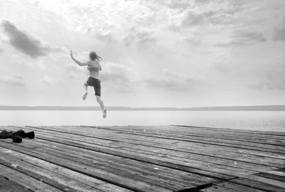 причал и девочка прыгающая с него в озеро