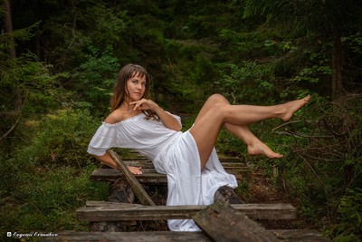 Странная композиция, честно говоря. Полное отсутствие связи между моделью и окружением.. Это поза откровенно для будуара, как и одежда, и лес с гнилыми досками как то не то что контрастируют, а скорее вносят дисгармонию..
