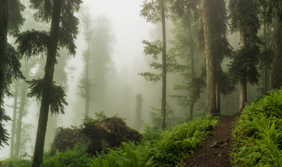 Величественный лес объёмно выступает из тумана! Красивая работа!