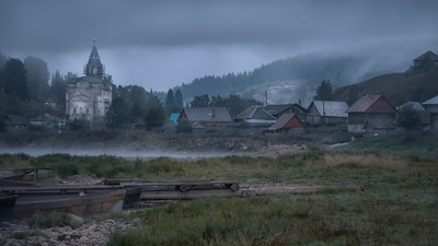 Хмурое уральское утро Я уже писал про туманное утро 22 августа, в селе Кын-завод. Этот кадр сделан тогда-же, в предрассветном туманном полумраке, который как нельзя лучше иллюстрирует типичную погоду Урала. В кадре, сделанном с берега Чусовой, видны прибрежные дома, Свято-Троицкая церковь и характерная "многоэтажность" села, где каждая улица находится на своем уровне, на слонах гор. |