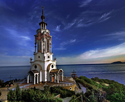 Яркий солнечный денёк в Малореченском Крым, Алушта. Храм-маяк Святого Николая Мирликийского был возведен совсем недавно в 2004–2006 гг. в память обо всех погибших на водах и путешественниках. У этого оригинального храма видимого из многих точек южного побережья Крыма нет аналогов во всем мире, благодаря чему он привлекает множество туристов. Архитектор А. Гайдамак использовал древнегреческие и ранневизантийские элементы. Photo by Sergey-Nik-Melnik Красивые фотографии Крыма в высоком разрешении |