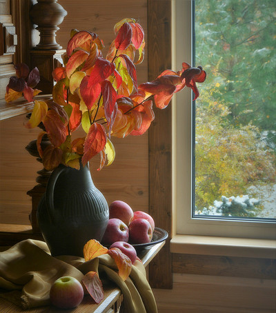 Вид в окне подчёркивает наступившую осень! Натюрморт классный!