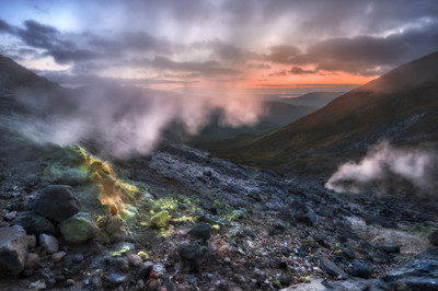 Итуруп. Фумаролы вулкана Баранского. Верхние фумарольные поля вулкана Баранского. Этот кадр было сделать не так уж и просто, т.к. ветер периодически направлял сернистый пар прямо в лицо и на камеру. Приходилось постоянно задерживать дыхание и протирать запотевающую линзу объектива. ⠀ Остров Итуруп, Курилы, сентябрь 2019г. Nikon D800 + Nikkor 16-35 VR (16 mm, F9, 1/40 sec, iso 400). |
